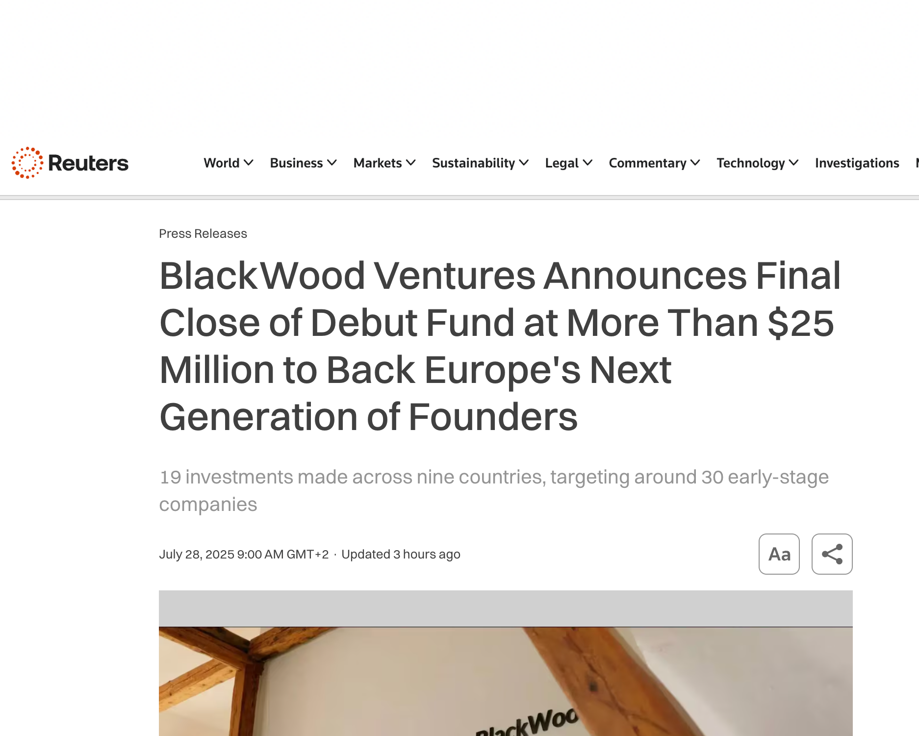 BlackWood Ventures, a network- and technology-driven early-stage fund focused on European founders, announces today the final close of its debut USD 25 million fund.